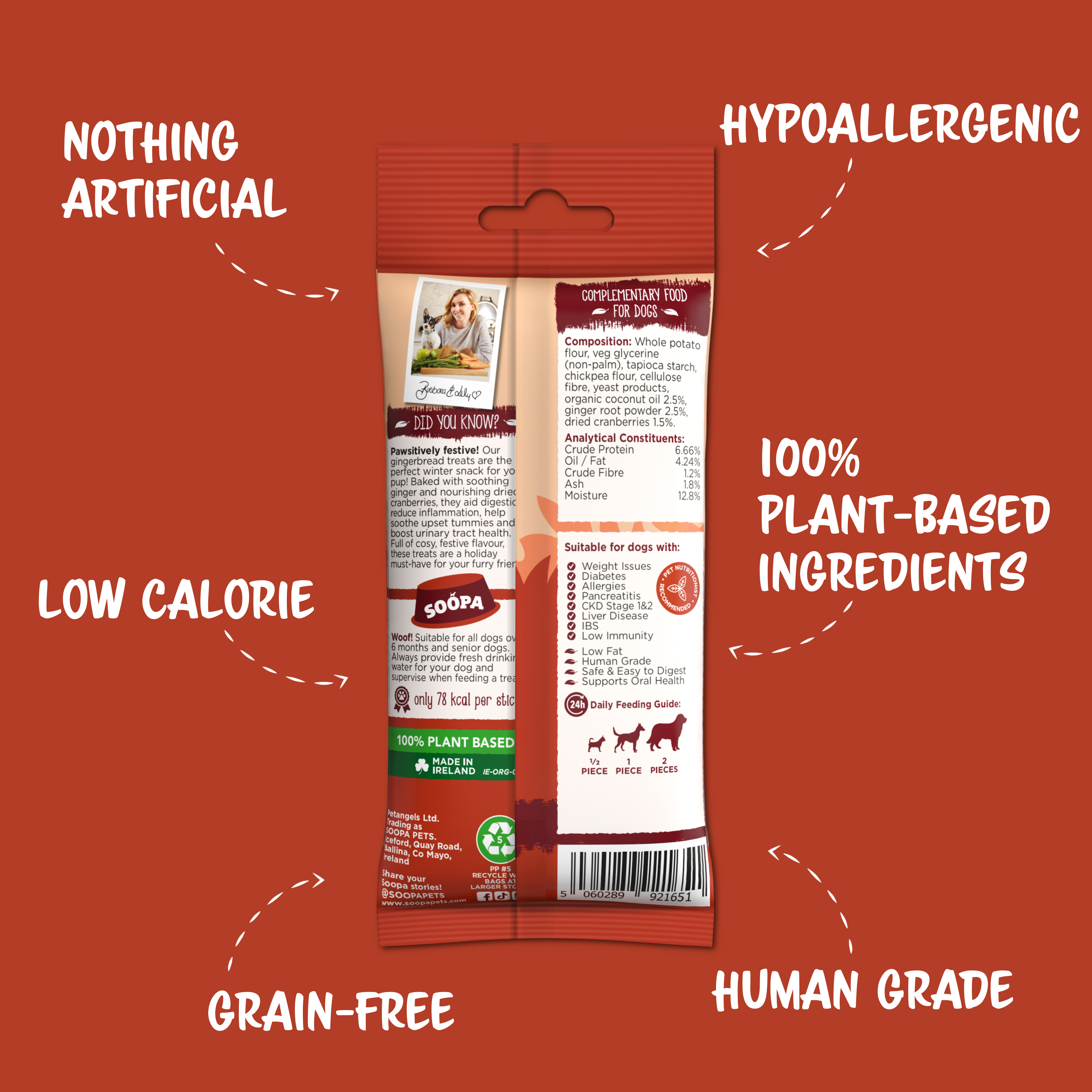 Pawsitively Festive! Our Gingerbread treats are the perfect winter snack for your pup! Baked with soothing ginger and nourishing cranberries they aid digestion, reduce inflammation, help soothe upset tummies and boost urinary tract health. Full of cosy, festive flavour, these treats are a holiday must-have for your furry friend!