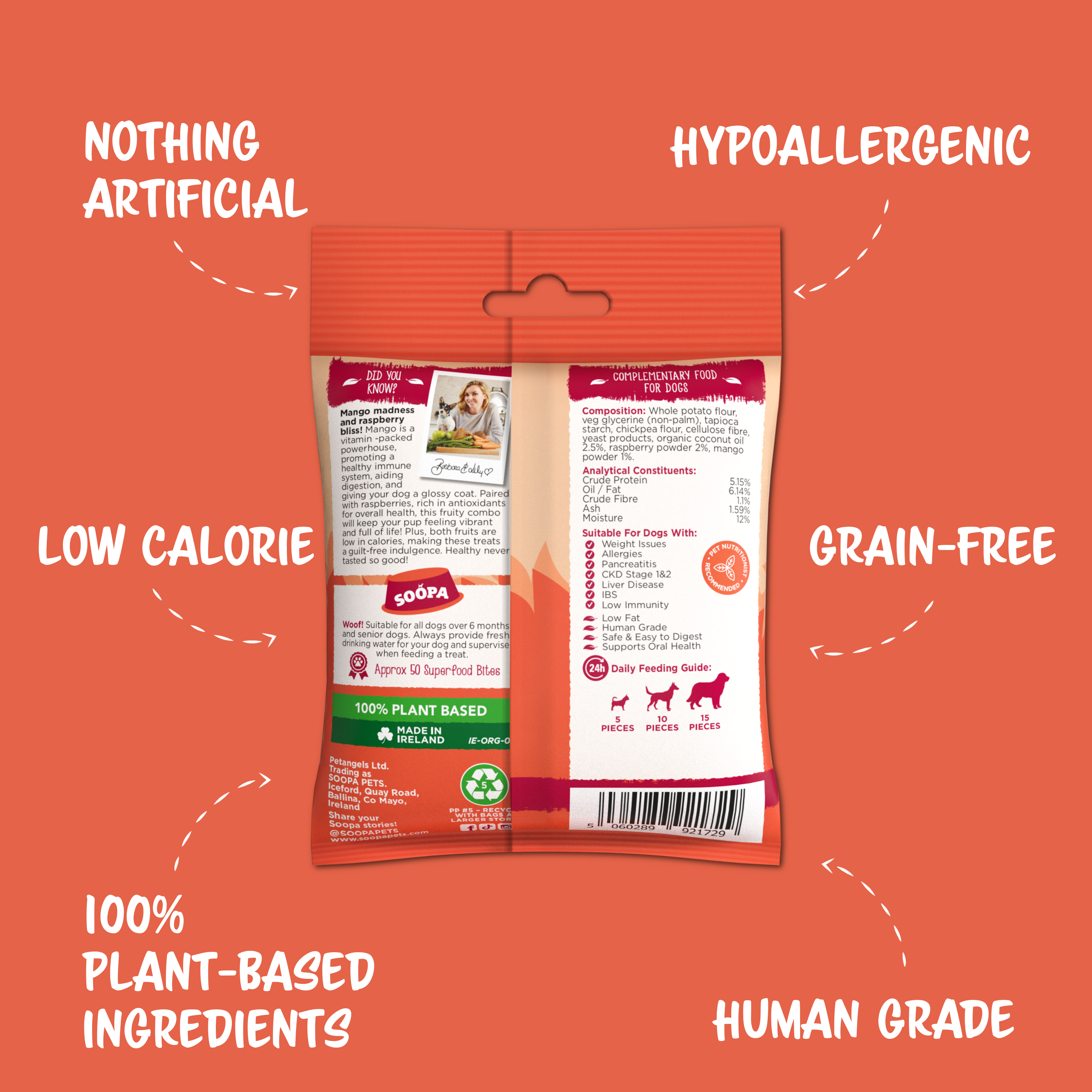 Soopa Healthy Bites are a hypoallergenic grain-free treat for the dog that loves to chew. Made using natural human-grade ingredients they help keep teeth clean and improve doggie breath. These treats are bursting with vitamins & minerals and health benefits. Simple, delicious, nutritious and best of all dogs LOVE them!