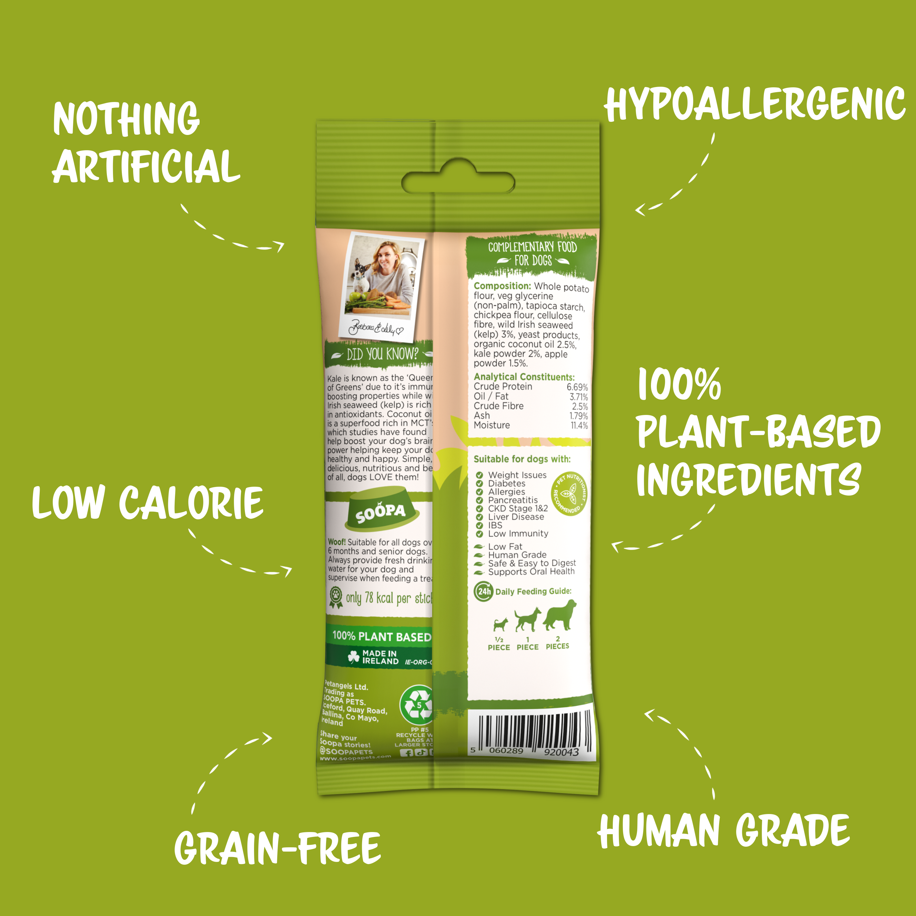 Soopa Dental Sticks are a hypoallergenic grain-free treat for the dog that loves to chew. Made using natural human-grade ingredients they help keep teeth clean and improve doggie breath. These sticks are bursting with vitamins & minerals and health benefits. Simple, delicious, nutritious and best of all dogs LOVE them!