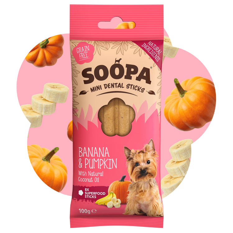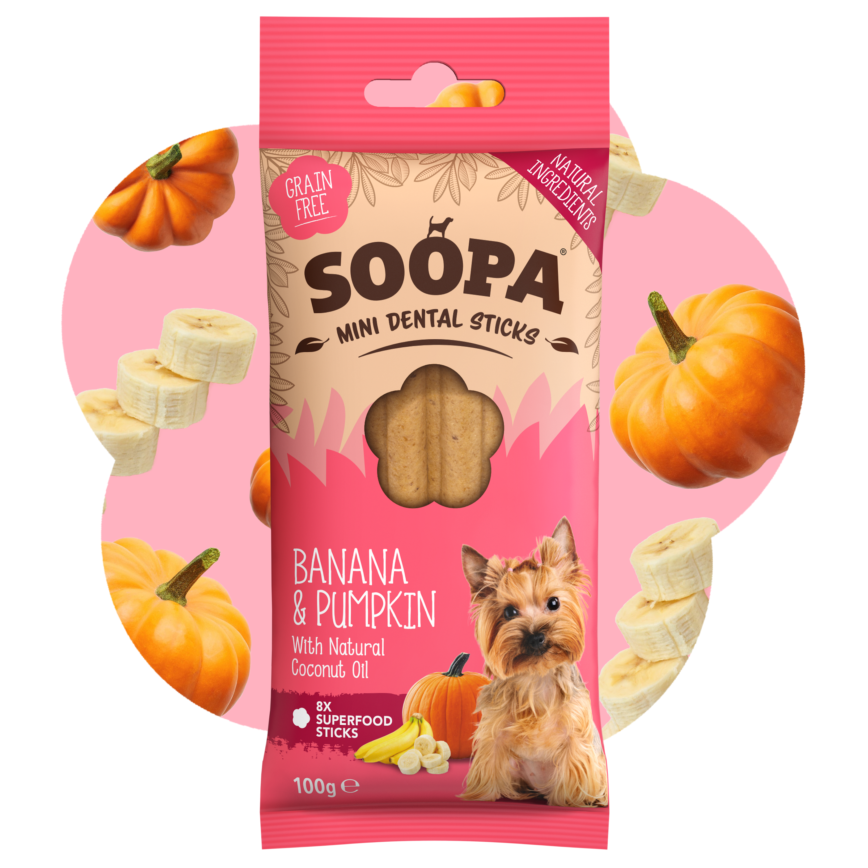 Soopa Dental Sticks are a hypoallergenic grain-free treat for the dog that loves to chew. Made using natural human-grade ingredients they help keep teeth clean and improve doggie breath. These sticks are bursting with vitamins & minerals and health benefits. Simple, delicious, nutritious and best of all dogs LOVE them!