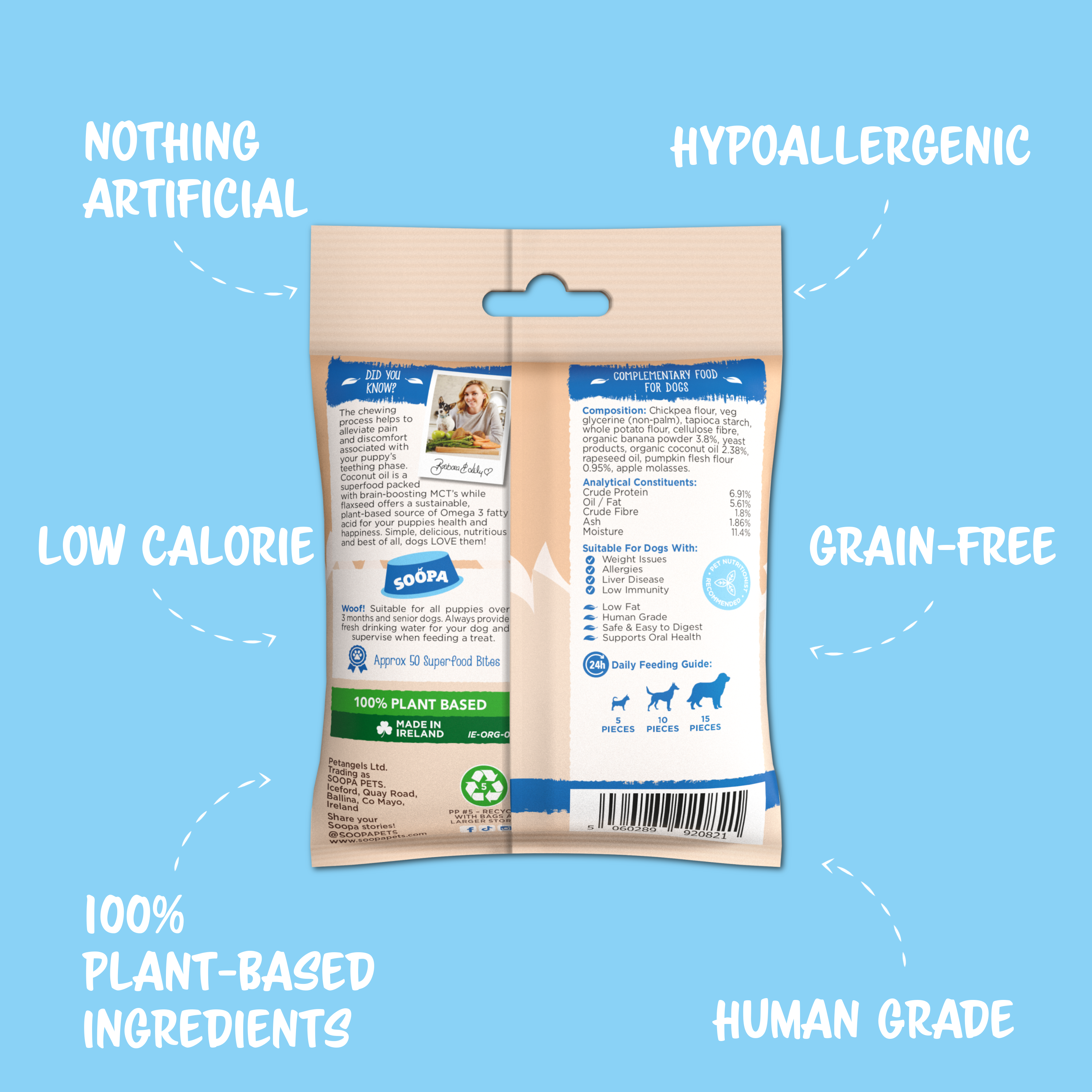Looking for puppy dog treats that are as healthy as they are tasty? Our Soopa Puppy Dental Bites are the paw-fect training reward for pups aged 3 months and older. Made with 100% natural banana and pumpkin, these chewy bites help keep little teeth clean and fresh while being gentle on sensitive tummies.